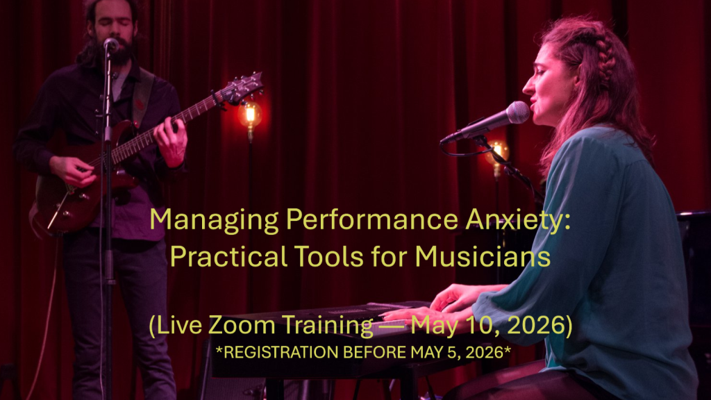 Workshop Managing Performance Anxiety for Musicians . In this 90-minute live Zoom workshop, you’ll learn practical tools to manage performance anxiety and perform with more focus under pressure. We’ll use short guided exercises and mini performance simulations to practise starting, staying present while being watched, and recovering quickly from mistakes. You’ll leave with a few simple personal tools you can use right away for your next performance.